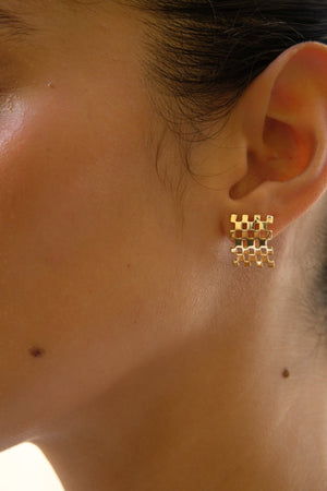 The Union Earrings feature an eye-catching negative space checkerboard pattern and curved structure. Inspired by interior design and human connection, the design relies on the support of each diagonal square to stay together.